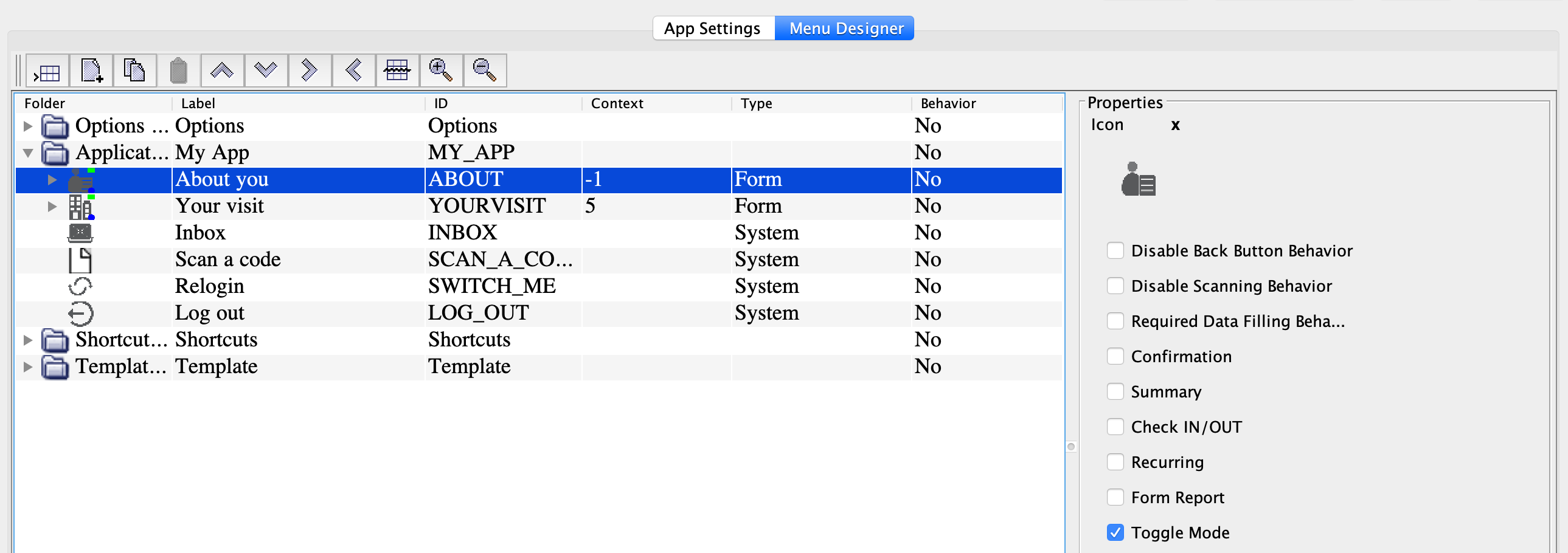 Go to the App settings tab and choose the NFC/ 2D Camera/ 1D barcode/Mobile ID option as an App type.
