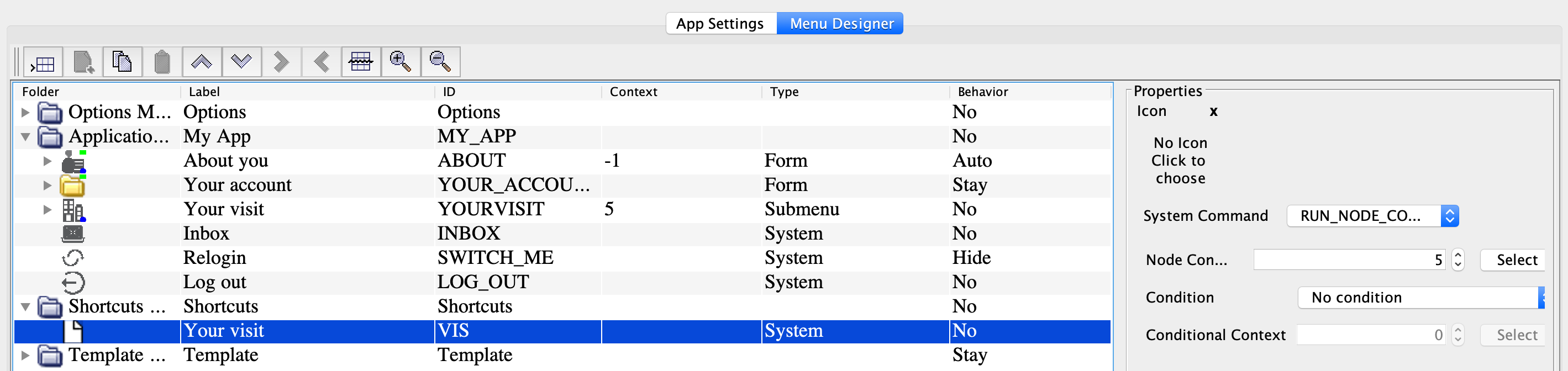 You can set up a transition from one node to another even if they are located far from one another in the app menu structure. A common case is setting up shortcuts in your app: when the user taps a shortcut icon ("Your visit" in the example), the relevant menu node opens.
