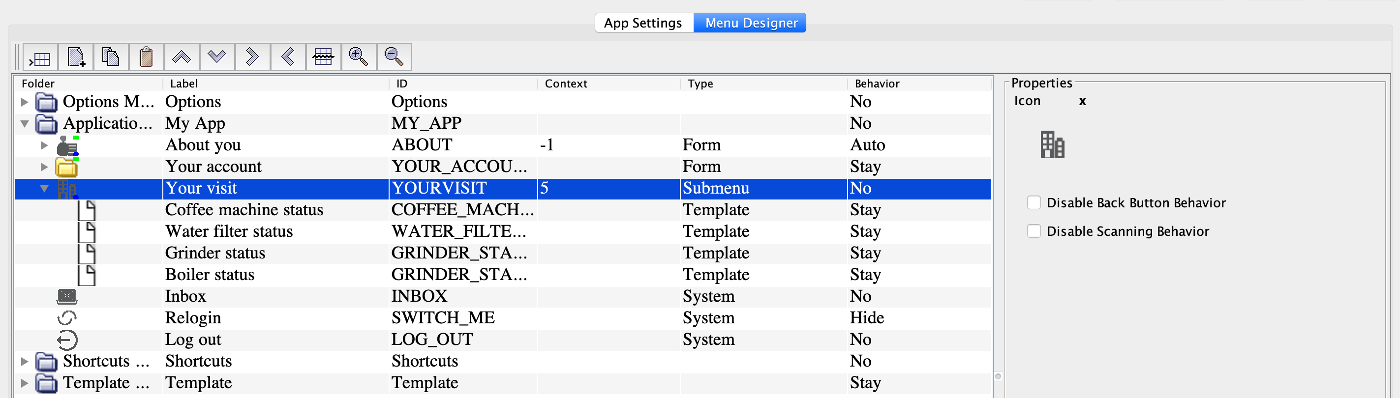 If your app features a Submenu node, for example "Your visit", you can tune it so that the user stays within the submenu when interacting with the nested nodes. For instance, here the user stays in the "Your visit" submenu after filling in one of the nested forms ("Coffee machine status") and can choose another form to fill in: