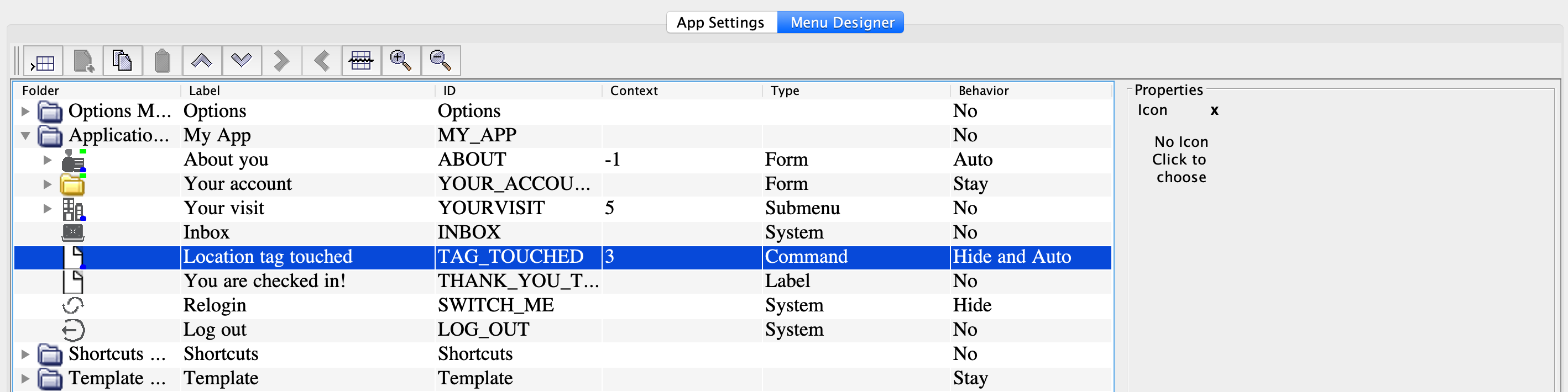 • Command node that can be triggered when the user touches the tag with the node context written into it ("3" in this case). The node sends the "Tag touched" string and the Location information to the web service. The node has Hide and auto behavior. This means that it won't be shown in the menu and that after the command transaction is sent, the app automatically passes to the sibling node.