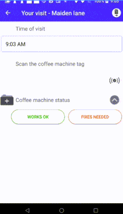 The Scan mode allows the user to scan a tag, QR code or a barcode and sends the serial number to the server. This node can be used, for example, in the asset management applications: the user scans a tag/code on the item to report that they have taken it.