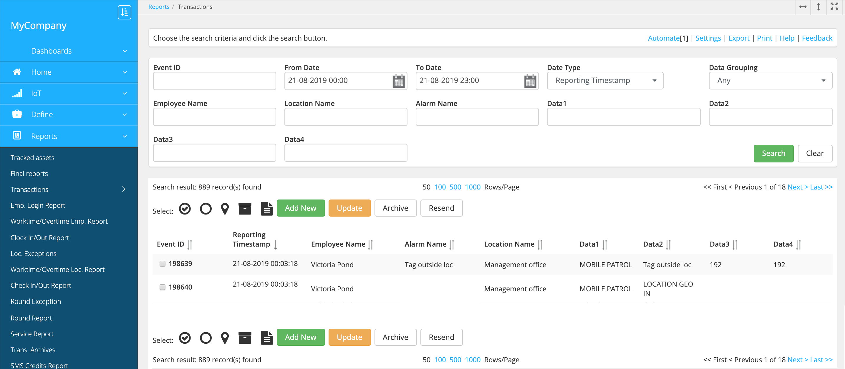 Each transaction has data fields (Data 1, Data 2, Data 3, Data 4). The content of these fields is defined in the application. You can view them in the Transactions report (Reports > Transactions), for example: