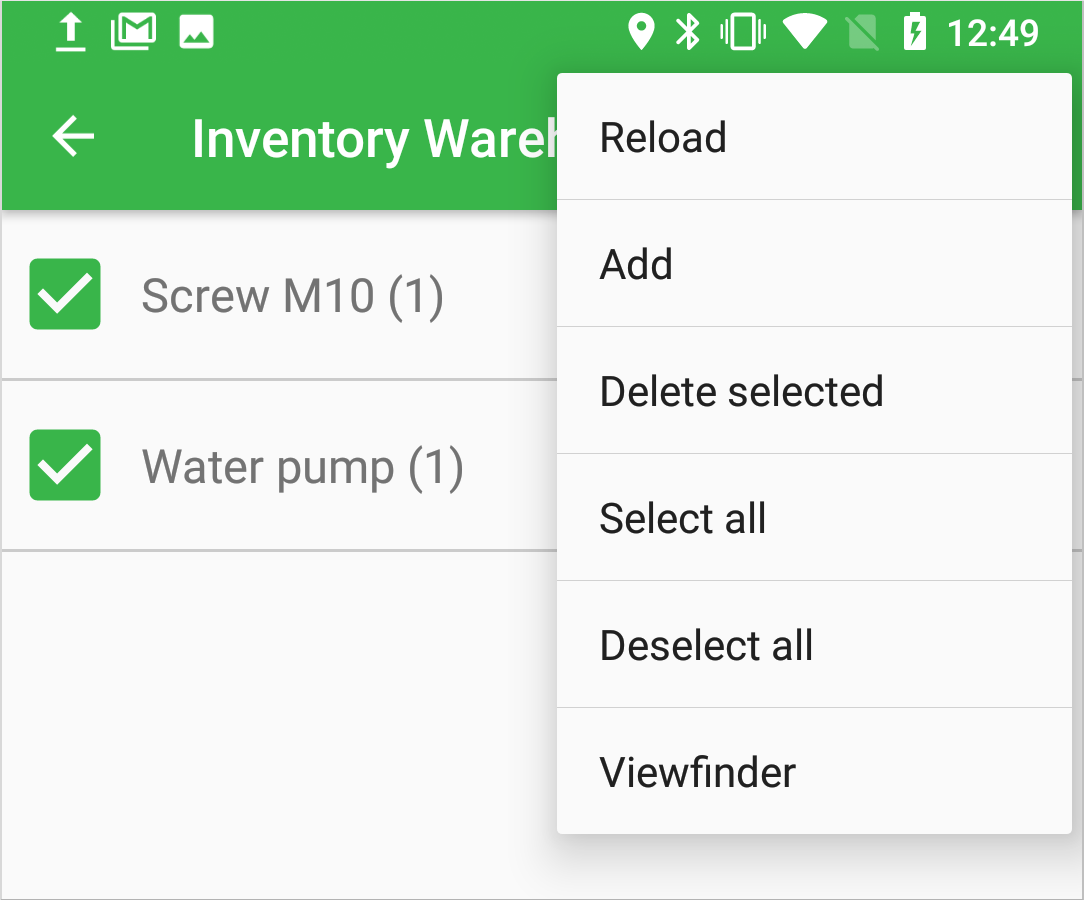 4. Tap Warehouse > Inventory warehouse, choose Viewfinder in the upper right corner menu and scan the asset label QR code.