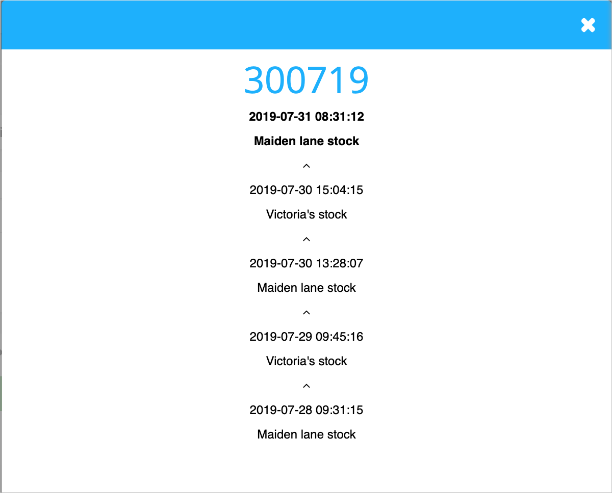 To track an asset and its transfers between the stocks, go to the page, choose the asset and click Track. The window shows the resent asset transfers.