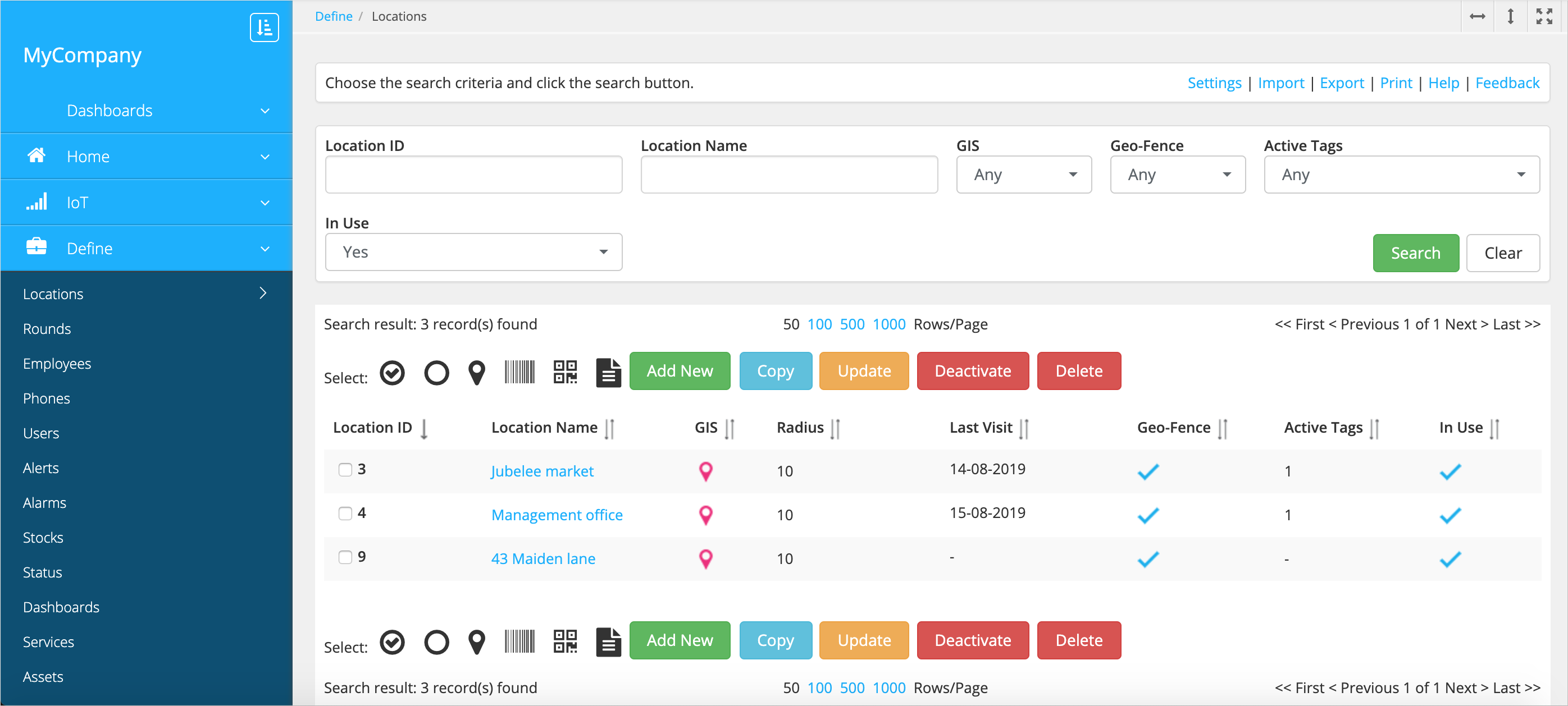 - The location status for information purposes. Statuses can be created on the page.