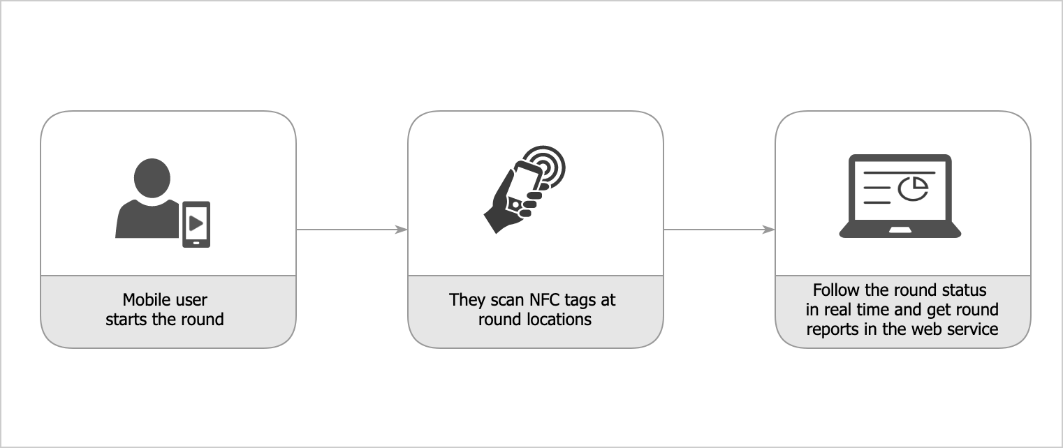 The Round management solution for security businesses helps you manage patrolling. Set out rounds – tasks to patrol a certain area within a certain time. Guards can view rounds in the Round management app. The guard starts a round, checks out the route, scans NFC tags at the checkpoints and reports back via the app. You can view the data about the current rounds online, receive notifications and round reports.