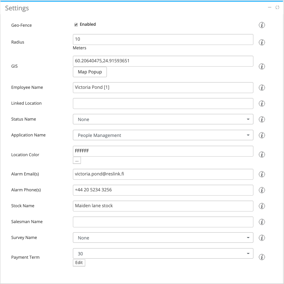 (Optional) Enter the location coordinates and radius in the GIS field in the Settings block (alternatively, you can add them later on the spot with the Reslink app). Location coordinates and radius are needed if you are going to use GPS tracking and geofencing.
