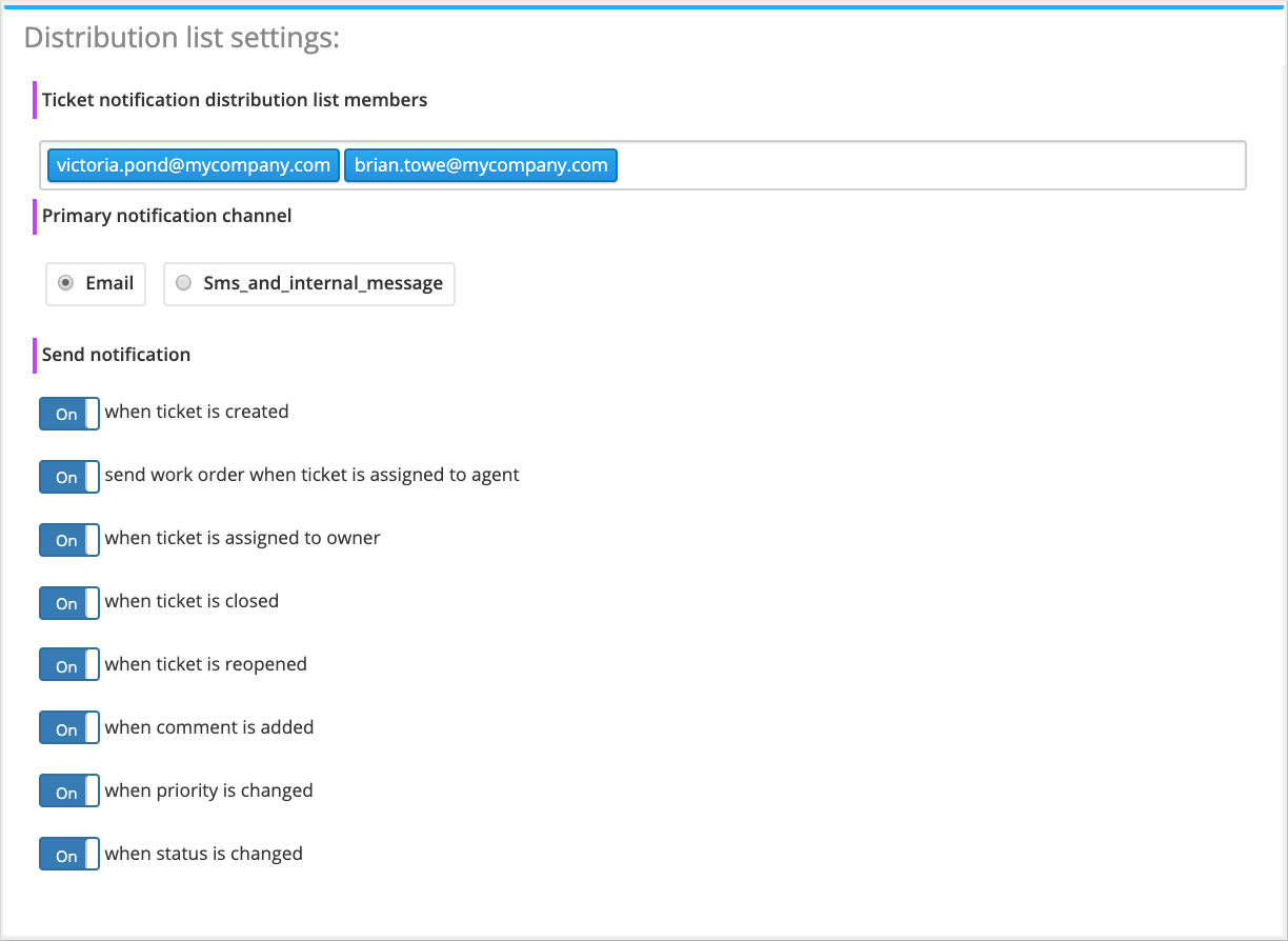 - Distribution list settings – List of emails, phone numbers (for SMS) or users (for internal messages) to send the ticket notifications to.