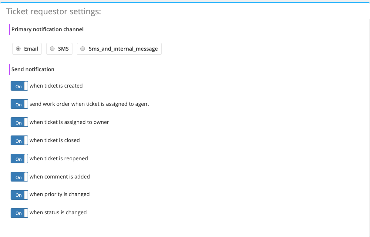- Ticket requester settings – Notifications for the person who submitted the request (via the app or via other channels). If the ticket is created via the app, the system identifies the user who sent it. If the ticket is created in the web service, the requester contacts (email and phone number) are specified in the ticket.